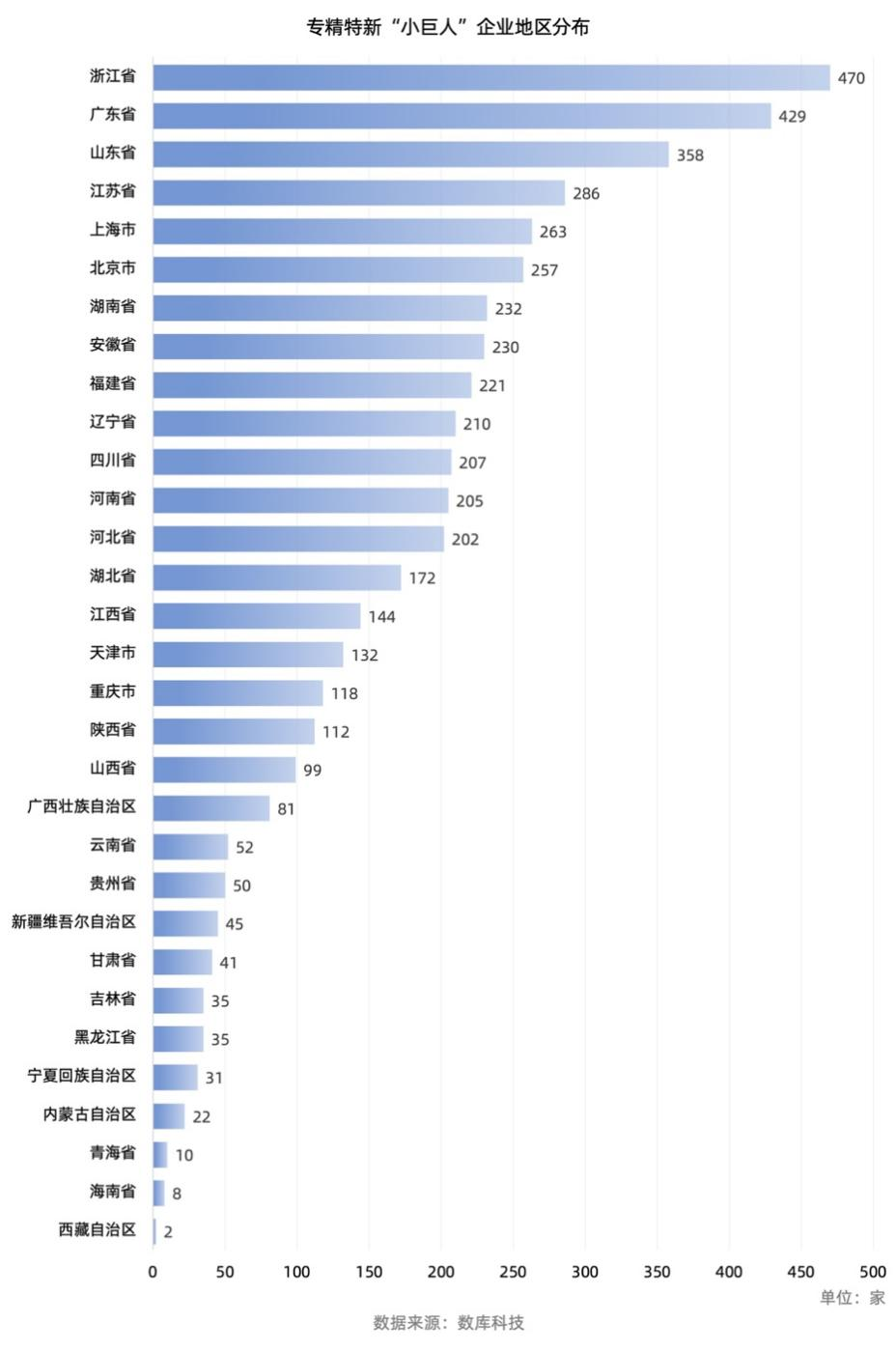 從地域上看,數(shù)庫(kù)科技數(shù)據(jù)顯示,入選國(guó)家工業(yè)和信息化部的專(zhuān)精特新“小巨人”企業(yè)主要分布在東部沿海地區(qū),其中浙江省470家,廣東省429家,山東省358家,江蘇省286家,上海市263家,位居前五。