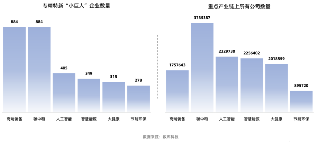 聚焦近年來(lái)國(guó)家重點(diǎn)扶持的行業(yè),結(jié)合數(shù)庫(kù)科技數(shù)據(jù)分析,在碳中和、高端裝備、人工智能、智慧能源、大健康和節(jié)能環(huán)保這六條產(chǎn)業(yè)鏈上,國(guó)家級(jí)專(zhuān)精特新“小巨人”企業(yè)優(yōu)勢(shì)明顯。從絕對(duì)數(shù)量來(lái)看,碳中和產(chǎn)業(yè)鏈和高端裝備產(chǎn)業(yè)鏈上企業(yè)數(shù)量最多,以884家的數(shù)量并列第一。