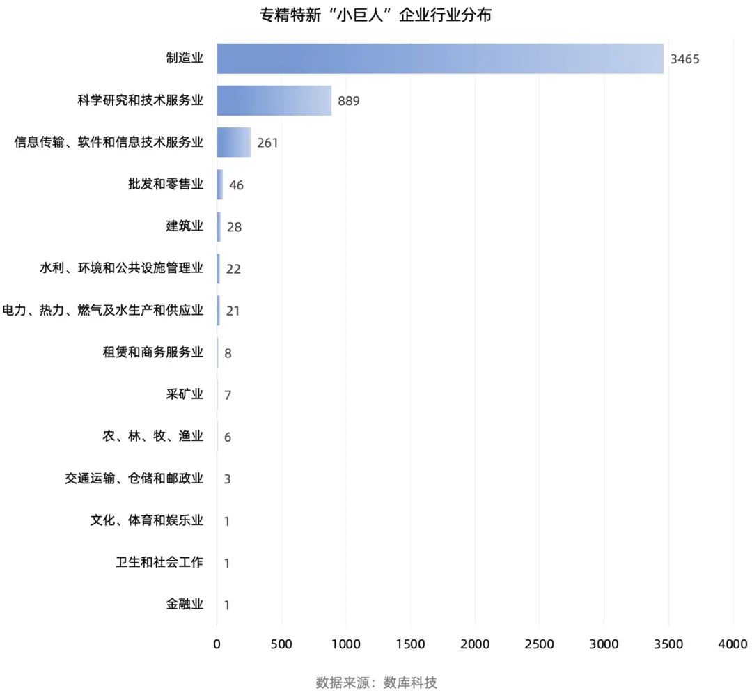 根據(jù)數(shù)庫(kù)科技數(shù)據(jù)顯示,專(zhuān)精特新“小巨人”企業(yè)超7成分布在制造業(yè),共計(jì)3465家。其中有40%以上主要分布在專(zhuān)用設(shè)備制造業(yè)、通用設(shè)備制造業(yè)、電氣機(jī)械和器材制造業(yè)三大行業(yè)。
