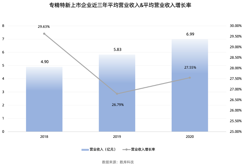 從企業(yè)營(yíng)收來(lái)看,專(zhuān)精特新“小巨人”上市企業(yè)近三年平均營(yíng)業(yè)收入持續(xù)增長(zhǎng),2020年第四季度,營(yíng)業(yè)總收入近7億元,增長(zhǎng)率27.55%。